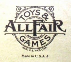 Few probably realize that Rochester, New York, was once home to a large game and toy manufacturer. Henry Alderman and Elmer E. Fairchild formed the Alderman-Fairchild Company in 1900 and initially printed paper goods and cardboard boxes for clients such as Rochester’s Fanny Farmer Candy. The city had grown into an important printing center during the late 19th and early 20th centuries, and the firm took advantage of local expertise in that field. When the market for luxury goods such as candy declined following World War I, the firm’s management elected to branch into game manufacturing. Branded as the catchy All-Fair Games, the games division began production around 1920.