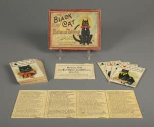 Perhaps one of the most famed fortune tellers was Marie Anne Lenormand of France. Lenormand practiced divination as an acclaimed professional for more than 40 years, advising many including the illustrious Empress Josephine—wife of Napoleon Bonaparte. Lenormand also published a variety of controversial texts during the 19th century, many of which earned the legendary soothsayer brief stays in jail. Lenormand died in 1843, but her legacy lives on with a 36-card divination deck bearing her name that is still used in parts of the world today, sometimes in conjunction with Tarot cards. Popular game manufacturer McLoughlin Brothers released its own version of the deck, Lenormand’s Mystic Cards of Fortune, in 1887. Rival company Parker Brothers produced fortune telling cards, first The Fortune Telling Game in 1890, followed by the Black Cat Fortune Telling Game in 1905, wherein printed cards are laid out categorically, with a single line of text aligning across four cards, revealing one’s fortune.