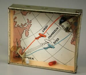 Other toys remind us of less-familiar history. A 1927 dexterity puzzle recalls that pilots Clarence Chamberlin and Richard Byrd intended to race Lindbergh from New York to Paris and compete for the $25,000 cash prize, but both were each delayed by unforeseen events. Chamberlin became the second pilot to fly across the Atlantic, but do any of us remember that today? Meanwhile, Parker Brothers brought out its own version of “We,” a game in which players move metal airplanes between “landing strips” by means of magnets on strings.