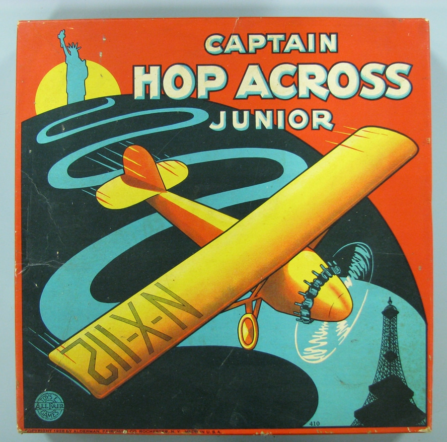 Toy makers knew that children found airplanes, flight, and heroes especially fascinating. Rochester’s All-Fair Games, known for bright and timely game designs, made the Captain Hop Across game in 1927. The game’s box lid shows The Spirit of St. Louis traversing a route from the Statue of Liberty to the Eiffel Tower and the propeller on a graphic of Lindbergh’s plane cleverly served as the game’s spinner.