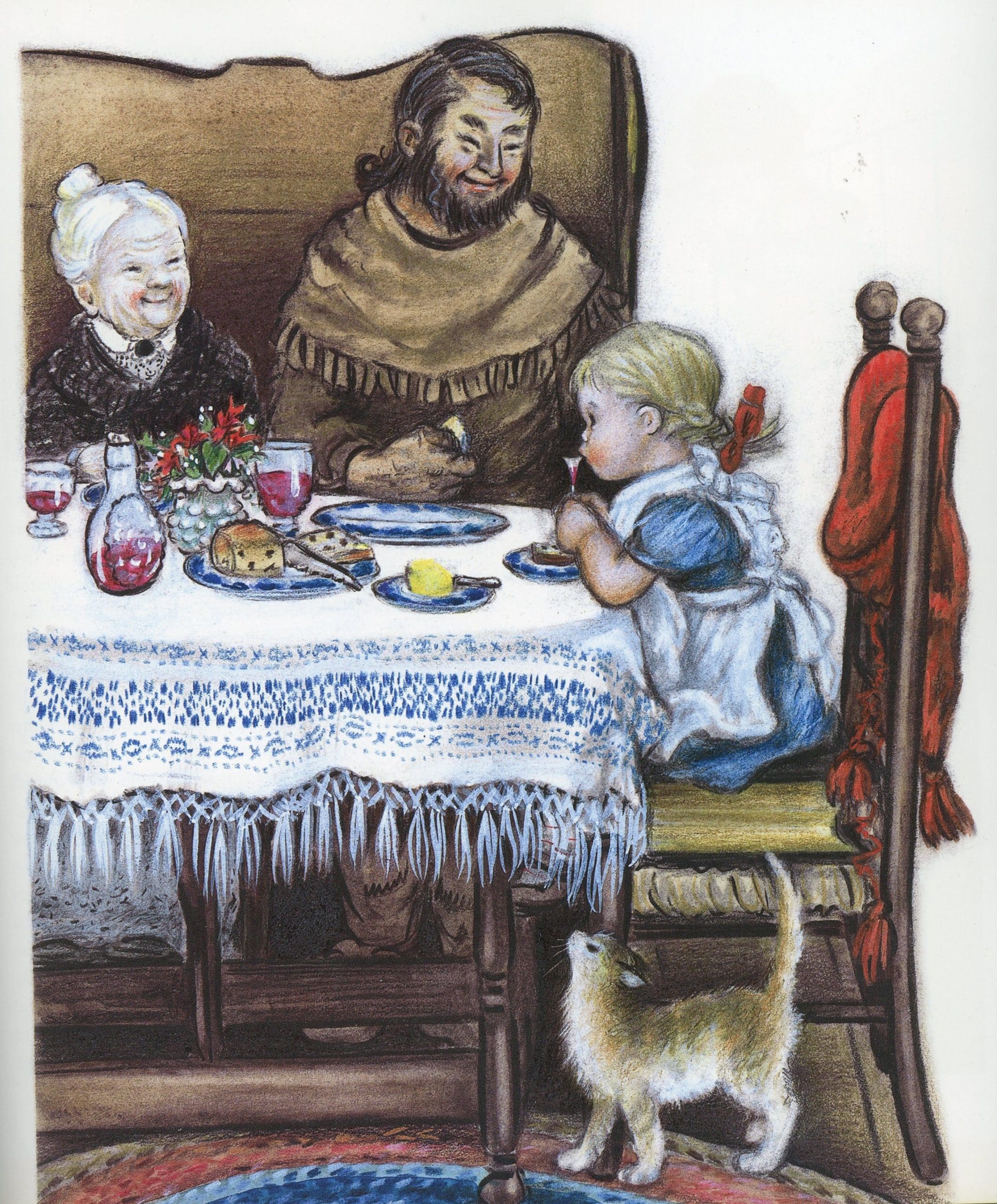 From a ravenous wolf that swallows a little girl whole to a lumberjack who cuts the wolf open, many versions of Little Red Riding Hood contain literary and visual images that leave readers unsettled. One tale of a controversial Little Red Riding Hood illustration begins with Little Golden Book’s editor Lucille Olge’s pursuit of illustrator and Caldecott Medalist Elizabeth Orton Jones during an American Library Association Annual Conference in the 1940s. Each morning during breakfast at the upscale Waldorf-Astoria, Jones found a note from Olge on her silver breakfast tray. Charmed by the editor’s compliments and persistence, Jones agreed to meet and, before the conference ended, she signed on to illustrate a Little Golden Book title of her choosing. In 1949, Olge published Little Red Riding Hood with the resulting pictures. As with most tales about Red Riding Hood, this one contains a twist. In Jones’ final illustration, Little Red Riding Hood (a small girl with blonde braids and a blue dress) held up a tiny tasting glass of red wine. Soon, Olge received hundreds of letters from outraged members of The Woman’s Christian Temperance Union. Despite the furor, the illustration remained.