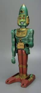 Advertised as a robot from the moon and perfect for lunar exploration, the 38-inch Big Loo functioned like a one-man, er, one-robot army. Louis Marx & Company, the largest toy maker in America at mid-20th century, introduced Big Loo in 1963. Operating on three D batteries, Loo flashed his red eyes at danger; and in his bullet-shaped head, he offered a sight-scope with crosshairs for accurately sighting legions of lunar enemies. His hand-cranked voice box uttered 10 phases, including such sparkling repartee as “I am Big Loo” and “Big Loo fights for you.” (Good to know the robot’s on your side.)