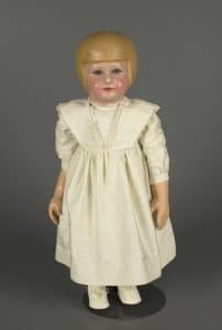 Martha Chase set up her doll-making operation at her home in a backyard building called the Dolls’ House. Chase’s small cottage industry employed a number of women as molders, painters, and seamstresses. By 1913 the workers of the Dolls’ House produced play dolls, dressed or undressed, in six sizes ranging from 12 to 30 inches and retailing for $2.50 to $7.50. The dolls, though not cheap by early 20th-century standards, reached customers nationwide and sold well in department stores like Macy’s, Best & Co., Gimbel Brothers, and Wanamaker’s, as well as toy stores such as F. A. O. Schwarz.