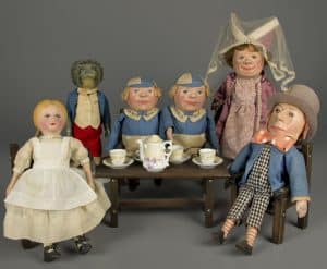 At the turn of the 20th century, toy makers introduced dolls based on characters from history and popular children’s books to promote gender-neutral doll play. Chase began making her story character dolls in 1905 when she offered several figures from Lewis Carroll’s Alice in Wonderland. She made dolls of George and Martha Washington, Roger Williams, and characters from Charles Dickens’s novels. Martha Chase died in 1925, and her family continued in the doll-making business into the 1970s. Her ideas about doll play remain as relevant today as they did 100 years ago.