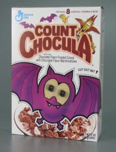 As is the case with most breakfast cereals whose cartooned mascots loom larger than any printed claims of nutritional value, my feelings about this cherished product and that fanged foreigner, its primary endorser, are intertwined. When I glimpse Count Chocula’s beautiful, brown widow’s peak in the cereal aisle, I feel joyful. The image triggers a multisensory experience: I can hear his low, gravelly voice, see him flourishing his collared cape, feel the crunch of the frosted corn cereal, and taste the sweetness of the marshmallows.
