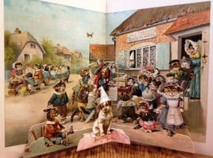 Transcending color, publishers also began to experiment with the concept of “toy books” with moving pictures and transformations, as well as other novelties such as tunnel books and pop-up books. Among pop-up books, Lothar Meggendorfer and Ernest Nister produced some of the best and most treasured examples. My own favorite is Nister’s The Children’s Tableaux. Pop-up books continue to appeal to talented contemporary artists, such as Robert Sabuda who uses their three dimensions to give new life to old stories such as Alice’s Adventures in Wonderland and The Wonderful Wizard of Oz.
