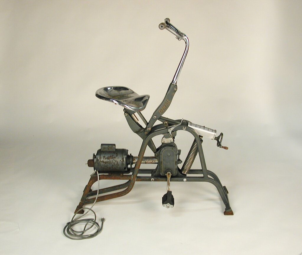 The Strong’s collections reveal the lengths people have gone to achieve a better body and all that comes with it. An exercise bicycle, designed with a 1/2-horsepower motor for therapeutic purposes, predates the 1970s craze for cardiovascular exercise and aerobics but presages the stationary bikes yet to come. A friend of mine fearlessly cycles through any city—New York, Paris, London—but I’m a bit wary of traffic and prefer bikes that don’t go anywhere. Modern spinning bikes improve on the 1930s version—they measure your revolutions per minute and the wattage you’re generating while your calves, quads, and glutes burn.