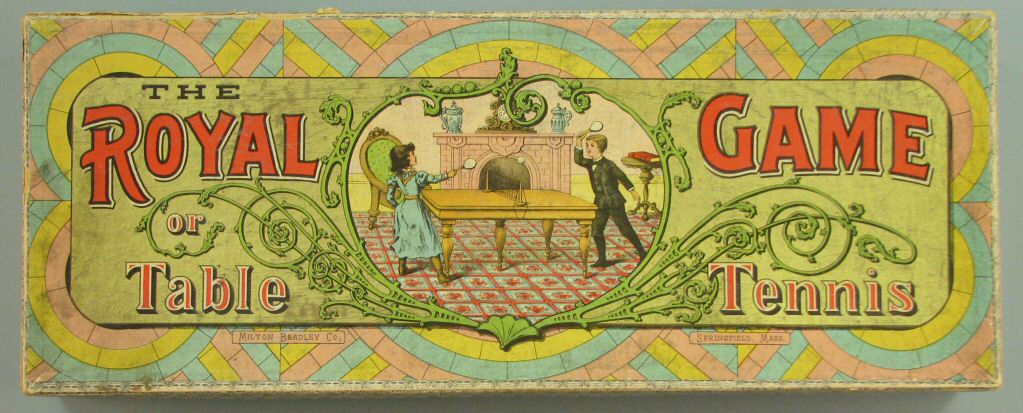 Summer, even late summer, means tennis for many who love the warm weather, the sunshine, and the great outdoors. And for those of us who hate to swelter and prefer to get our exercise in air-conditioned splendor, there’s always indoor tennis. The tabletop game goes by many names: table tennis and Ping Pong sound familiar, but some early players knew it as Gossima, Whiff Whaff, parlour tennis, Pom-Pom, Netto, or tennis de salon. According to historians, it began among the upper class in Britain in the 1880s as a parlor game in which the players used books or cigar-box lids for rackets, a cork from dinner’s champagne bottle for a ball, and books lined up on their spines for the net at the center of the table. As the game grew in popularity, manufacturers offered game sets of rackets, a net, and a ball made of celluloid. The new material made the ball produce a unique sound—ping pong—against the paddle and the tabletop and gave the game its alliterative name.