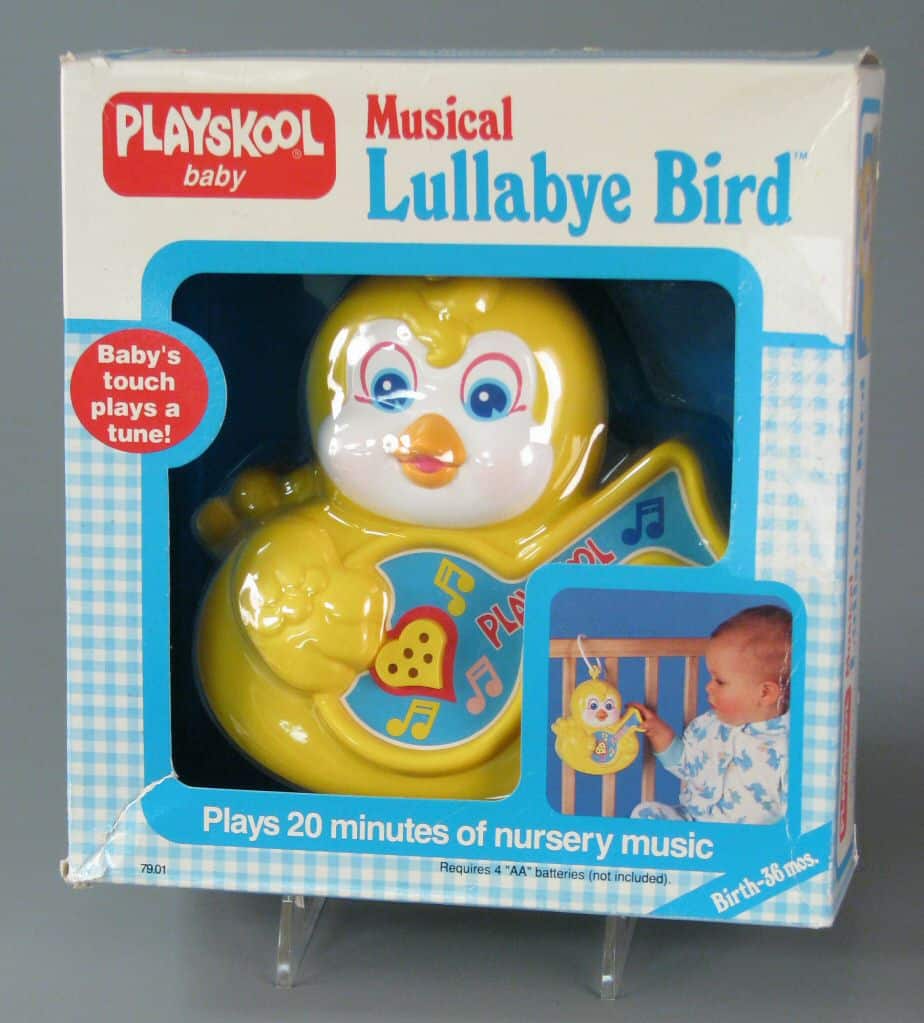 No wonder so many toys and games utilize music in one form or another. Toddler toys use sounds as means of teaching children colors, shapes, and fine tuning motor skills, employing songs and sounds as positive reinforcement when a child accomplishes a task. Playskool’s popular Alphie the Electronic Robot toy first appeared on the market in 1978 and offered a technological twist on the learning experience, combining play and sound with a friendly robot that lit up and played joyful little ditties when users answered questions correctly. This clever android remains popular into the 21st century with a variety of booster packs used for teaching various ages and subjects. Alphie’s creator, electronics wizard Greg Hyman, has produced a wealth of other playthings all of which incorporate sound and music to create an effective educational experience. An electrical engineer, Hyman devised a “music box” of the sounds and melodies for a television quiz show. Eventually that music box evolved into his first toy, Little Maestro Toy Piano Organ, released in 1977 by Creative Playthings. Other musical toys followed, including See N’ Say, Captain Morgan the Electronic Organ, and the Lullabye Bird that gently lulls children to sleep.