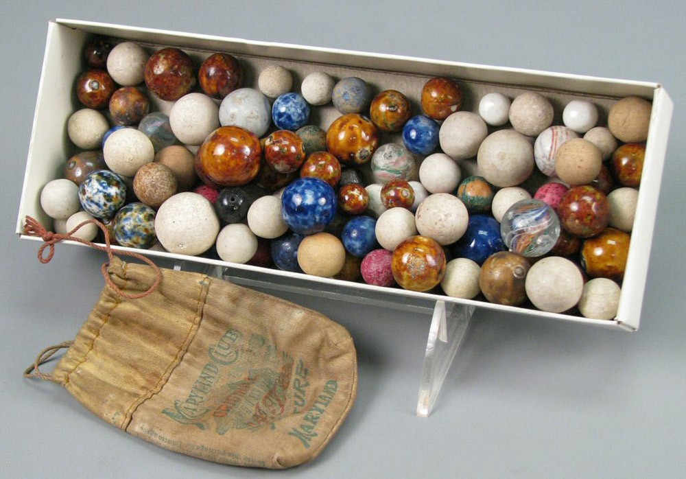 Though the game of marbles is ancient and played worldwide, mass-production of marbles themselves (made first from clay) didn’t begin in this country until the 1870s. Glass marbles became available only after the turn of the 20th century. Marbles’ popularity peaked during the first half of the 1900s. The first U. S. National Marbles Tournament was held in 1922 in Wildwood, New Jersey, where it still occurs annually. There, “mibsters” (marble shooters) compete annually for national honors, college scholarships, and numerous prizes and awards, while playing more than 1,200 games over a four-day period. Elsewhere, interest in the game has waned in the decades since the 1950s, partly because other, mostly electronic entertainments have, if you’ll pardon the intended pun, bumped the game aside.