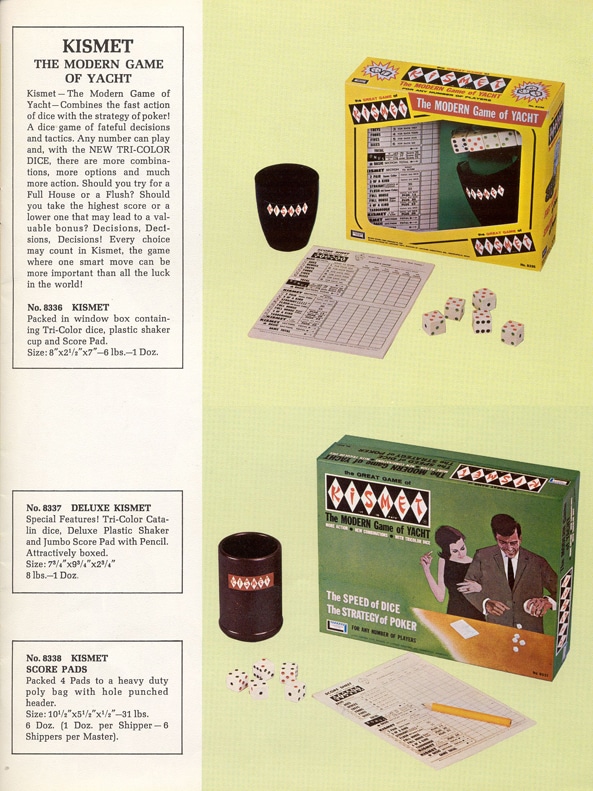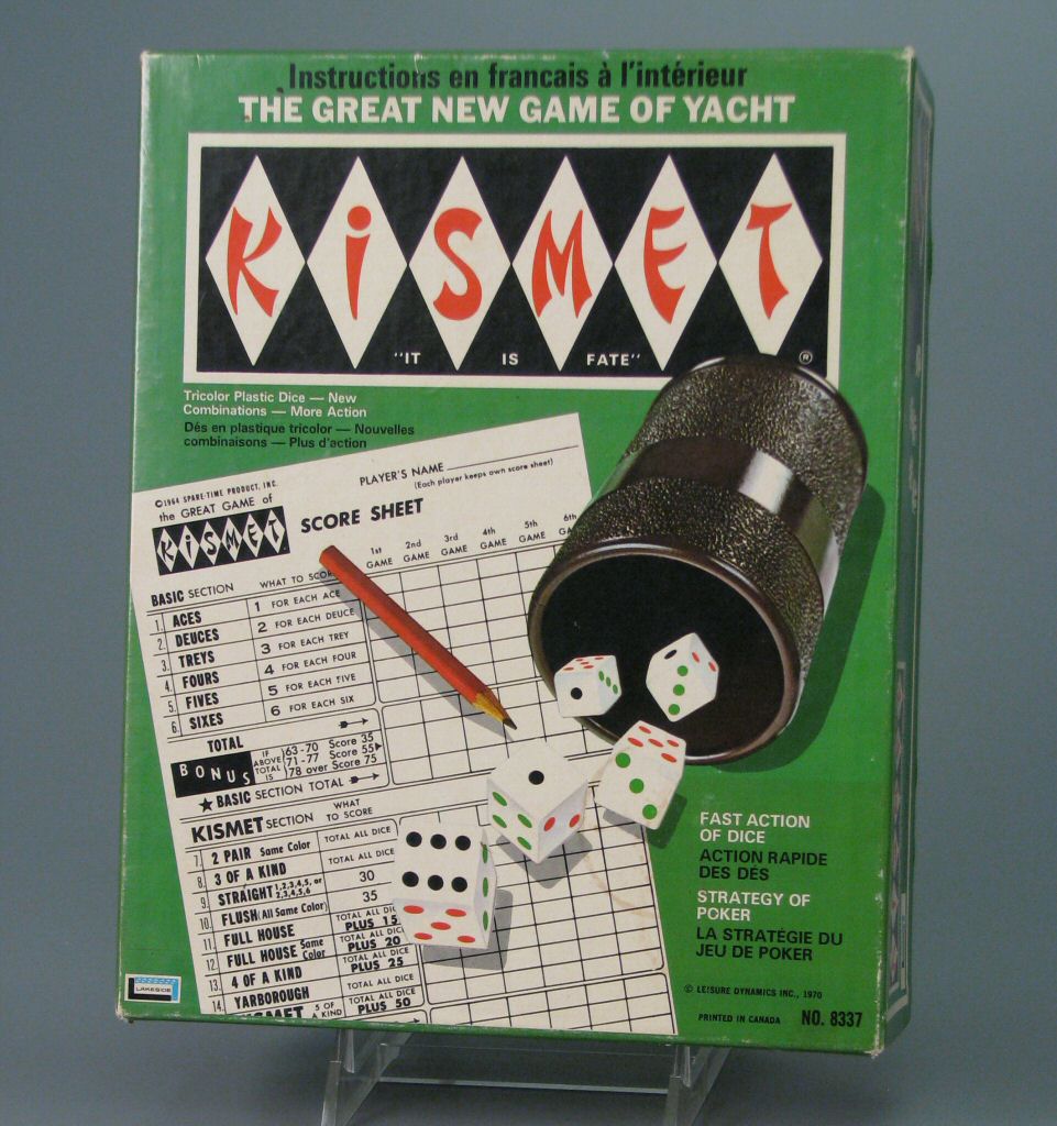 Scoring is similar in the two games, but Kismet includes tri-level scoring in the Bonus section versus the flat rate Bonus in Yahtzee. Also, instead of the “Chance” in Yahtzee, Kismet features the “Yarborough,” a section reserved for a roll of the dice that didn’t fit any other category. The “Yarborough” was always a welcome alternative to putting a zero on the score pad in some other field. Although Kismet is a game of chance, my Nana taught us strategies such as trying to complete the more difficult fields on the score sheet first before moving on to the easier ones.
