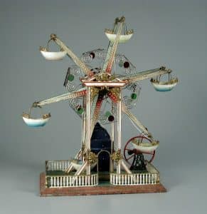 Ferris wheels also soon appeared as toys, and The Strong holds a rich variety in its collections. The Hy-Lo Ferris wheel carries its riders in what seem to be little Quonset huts—not so great for appreciating the view from the top of the ride. By contrast, the riders on this Ferris wheel seem to almost float in mid-air, supported by an airy superstructure. A 1915 German Ferris wheel sends its riders aloft on a skyward voyage in little boat-shaped gondolas.