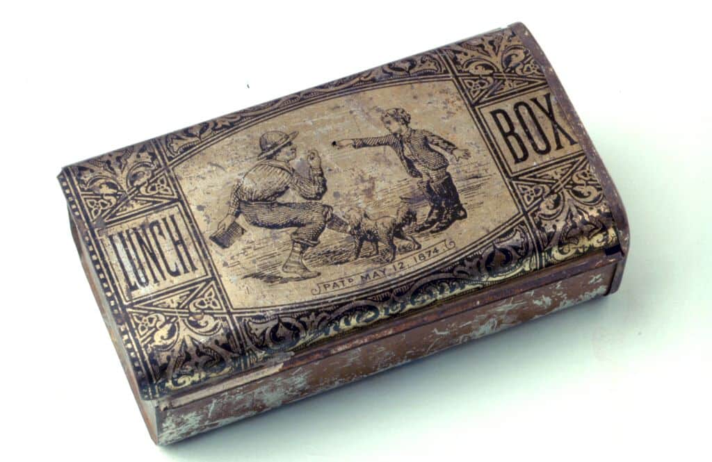 Plastic lunch boxes made their debut in 1972, offering manufacturers economies in material and production. Some parents also found plastic lunch boxes safer. With their rounded corners and lighter weight, plastic lunch boxes couldn’t inflict quite as much damage when a bully swung one at your cranium. However, lunch boxes began to seem like something that “little kids” carried and older students found other ways to express their identities. Sales declined. By the late 1990s, Baby Boomer nostalgia reached the field of lunch boxes, inspiring an active market for old boxes and prompting manufacturers to reissue classic and classic-look metal lunch boxes as collectibles. And, despite such alternatives as insulated fabric bags, Lunchables, or school fast food courts, I still see children carefully scanning the shelves of lunch boxes each fall, obviously debating the merits of the latest Disney movie over that hot video game as the way to carry a PBJ sandwich and position themselves in the grade school pecking order.