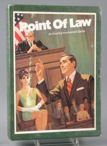Point of Law moves the legal game from the realm of criminal law to civil law, simultaneously taking players from trial courts to appeals courts. Based on a long-running radio show that started in 1952, Point of Law (1972) has players match wits and common sense to figure out which of four sample verdicts in a particular case is the correct one. The game features facts adapted from actual decisions issued by state and federal appeals courts. Players take sides and defend their opinions before consulting the holdings of the various cases appended to the end of the game book. Lawyers and law students will recognize the format of this game as “bar-exam lite,” and anyone who isn’t an attorney will see it as a forerunner of games like Scruples (1984), Wits and Wagers (2005), or Say Anything (2008). Point of Law sparks conversation and gets people thinking about how they would answer tough and often open-ended questions. Come to think of it, that’s exactly what lawyers, judges, and juries do every day. “Gotcha!” “No you didn’t!” “Objection, argumentative!” “Overruled.”