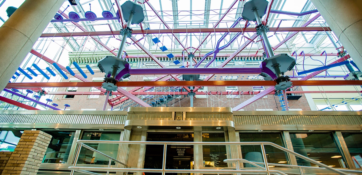 A soaring high-adventure ropes course provides challenging, yet safe, physical play.